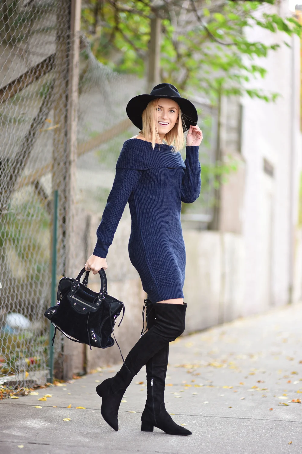 Favorite Combo Sweater Dress Over The Knee Boots Those White Walls